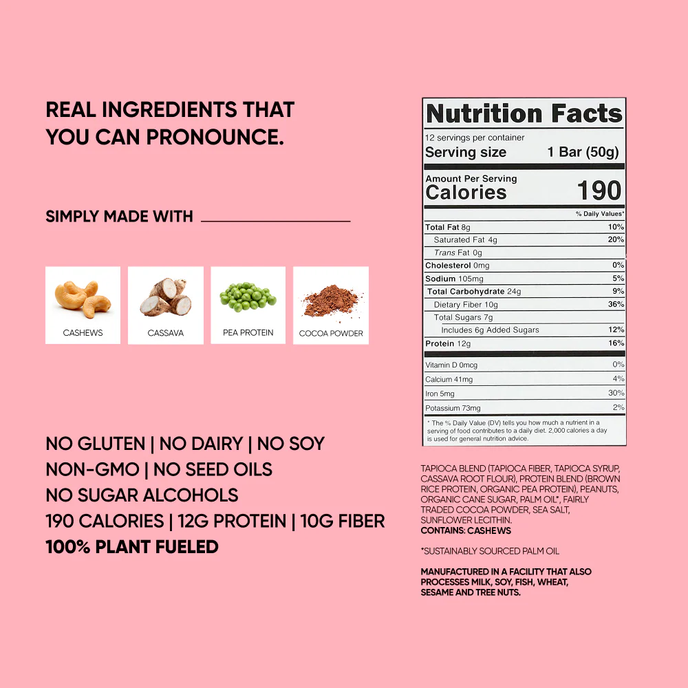 Ingredients: Tapioca blend (tapioca fiber, tapioca syrup, cassava root flour), protein blend (brown rice protein, organic pea protein), cashews, organic cane sugar, palm oil*, natural flavors, sea salt, sunflower lecithin, edible glitter (gum arabic, spirulina extract (color), red cabbage extract (color), turmeric extract (color), radish extract (color)).