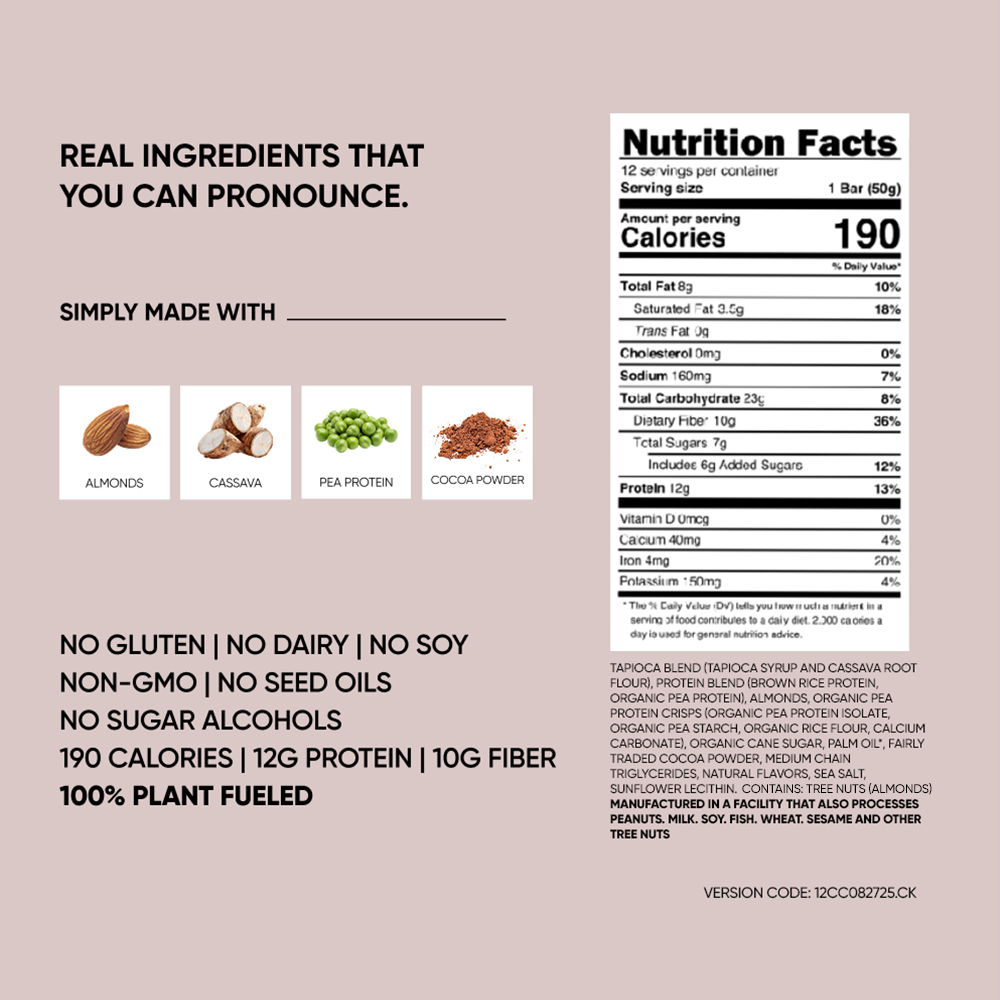 Ingredients: TAPIOCA BLEND (TAPIOCA SYRUP AND CASSAVA ROOT FLOUR), PROTEIN BLEND (BROWN RICE PROTEIN, ORGANIC PEA PROTEIN), ALMONDS, ORGANIC PEA PROTEIN CRISPS (ORGANIC PEA PROTEIN ISOLATE, ORGANIC PEA STARCH, ORGANIC RICE FLOUR, CALCIUM CARBONATE), ORGANIC CANE SUGAR, PALM OIL*, FAIRLY TRADED COCOA POWDER, MEDIUM CHAIN TRIGLYCERIDES, NATURAL FLAVORS, SEA SALT, SUNFLOWER LECITHIN.