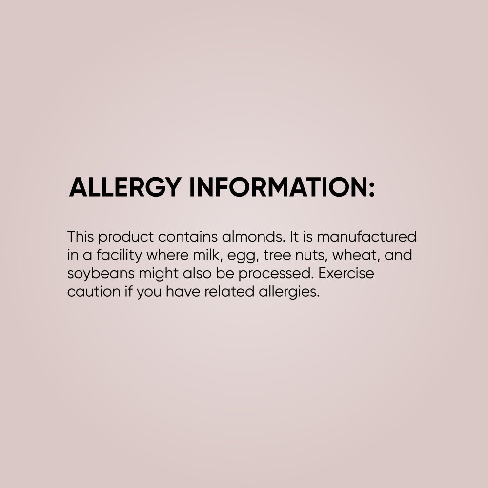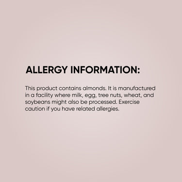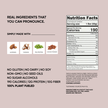 Ingredients: Tapioca blend (tapioca syrup and cassava root flour), protein blend (brown rice protein, organic pea protein), almonds, organic pea protein crisps (organic pea protein isolate, organic pea starch, organic rice flour, calcium carbonate), organic cane sugar, palm oil*, fairly traded cocoa powder, natural flavors, sea salt, sunflower lecithin.