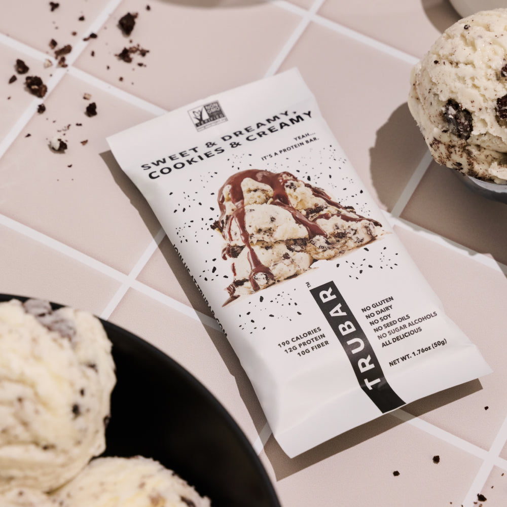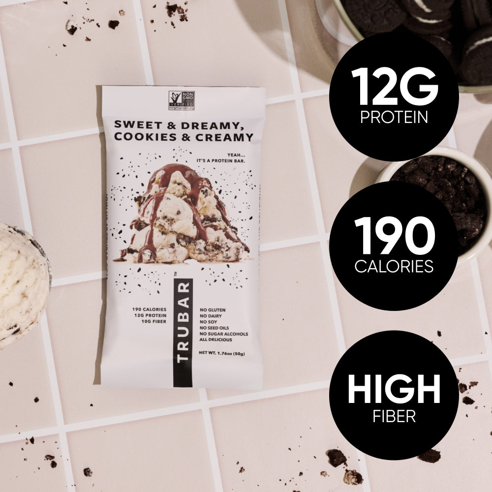 The TRUBAR Sweet & Dreamy, Cookies & Creamy protein bar is a smooth, cookie-stuffed fantasy—creamy, crave-worthy, and completely guilt-free.