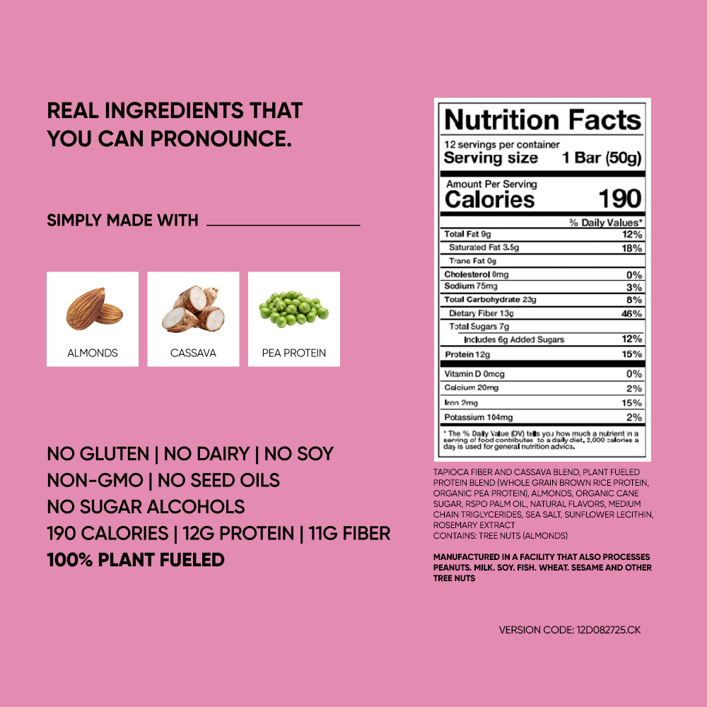 Ingredients: TAPIOCA FIBER AND CASSAVA BLEND, PLANT FUELED PROTEIN BLEND (WHOLE GRAIN BROWN RICE PROTEIN, ORGANIC PEA PROTEIN), ALMONDS, ORGANIC CANE SUGAR, RSPO PALM OIL, NATURAL FLAVORS, MEDIUM CHAIN TRIGLYCERIDES, SEA SALT, SUNFLOWER LECITHIN, ROSEMARY EXTRACT