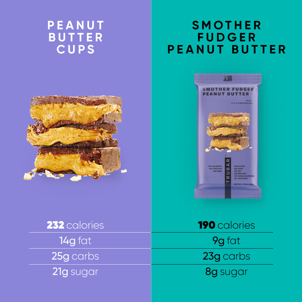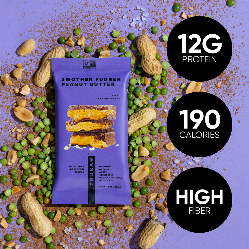 You’ll swear the TRUBAR Smother-Fudger Peanut Butter protein bar tastes too good to be healthy, but it’s true!  With 12 grams of vegan protein in every bar it will become your go-to source for nutritious plant-fueled protein.
