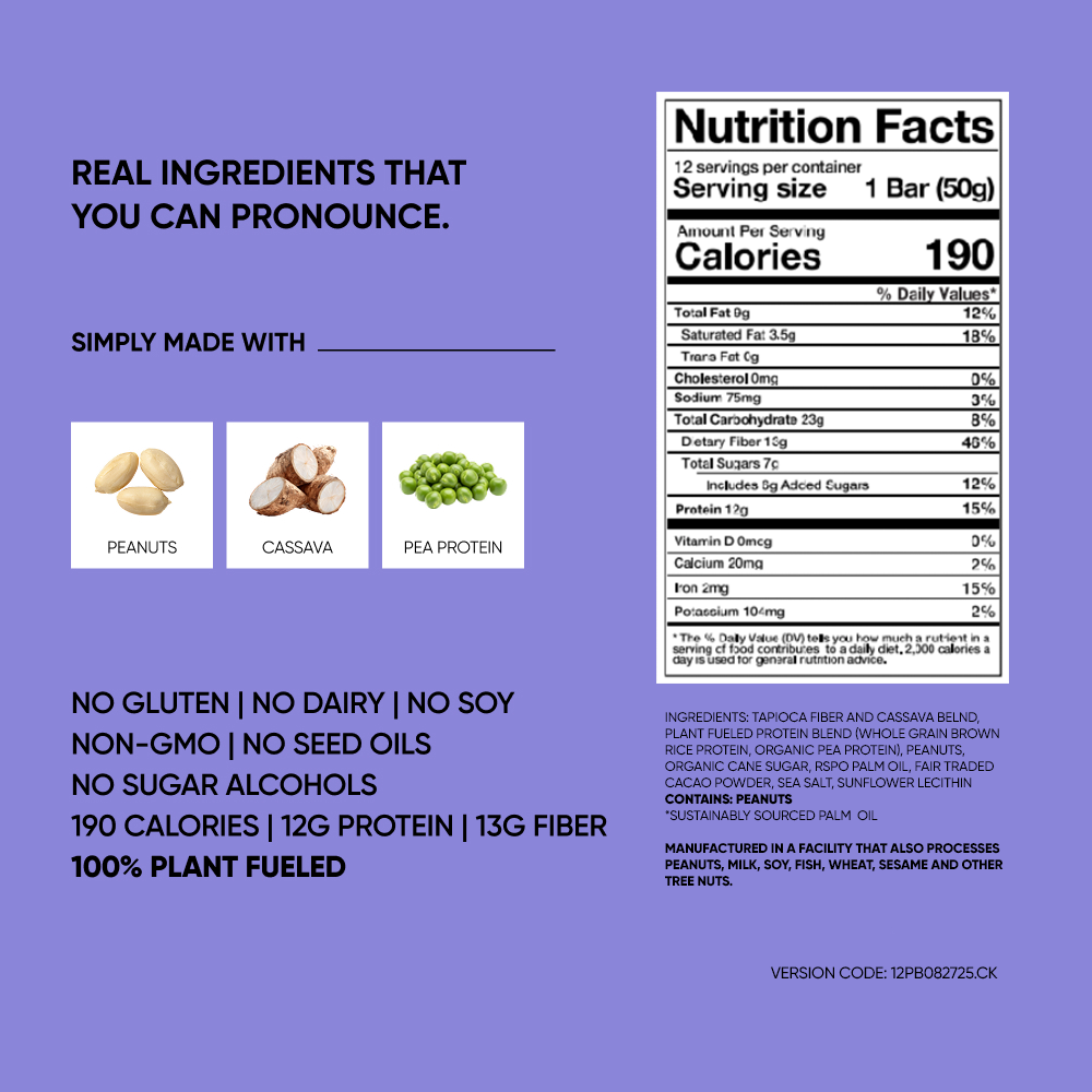 Ingredients: TAPIOCA FIBER AND CASSAVA BLEND, PLANT FUELED PROTEIN BLEND (WHOLE GRAIN BROWN RICE PROTEIN, ORGANIC PEA PROTEIN), PEANUTS, ORGANIC CANE SUGAR, RSPO PALM OIL, FAIR TRADED CACAO POWDER, SEA SALT, SUNFLOWER LECITHIN