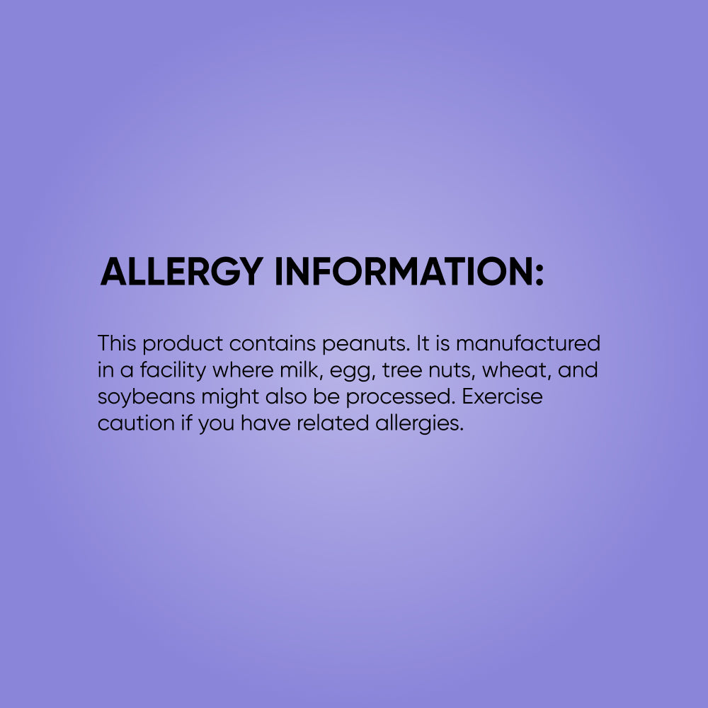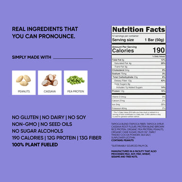 Ingredients: Tapioca blend (tapioca fiber, tapioca syrup, cassava root flour), protein blend (brown rice protein, organic pea protein), peanuts, organic cane sugar, palm oil*, fairly traded cocoa powder, sea salt, sunflower lecithin.