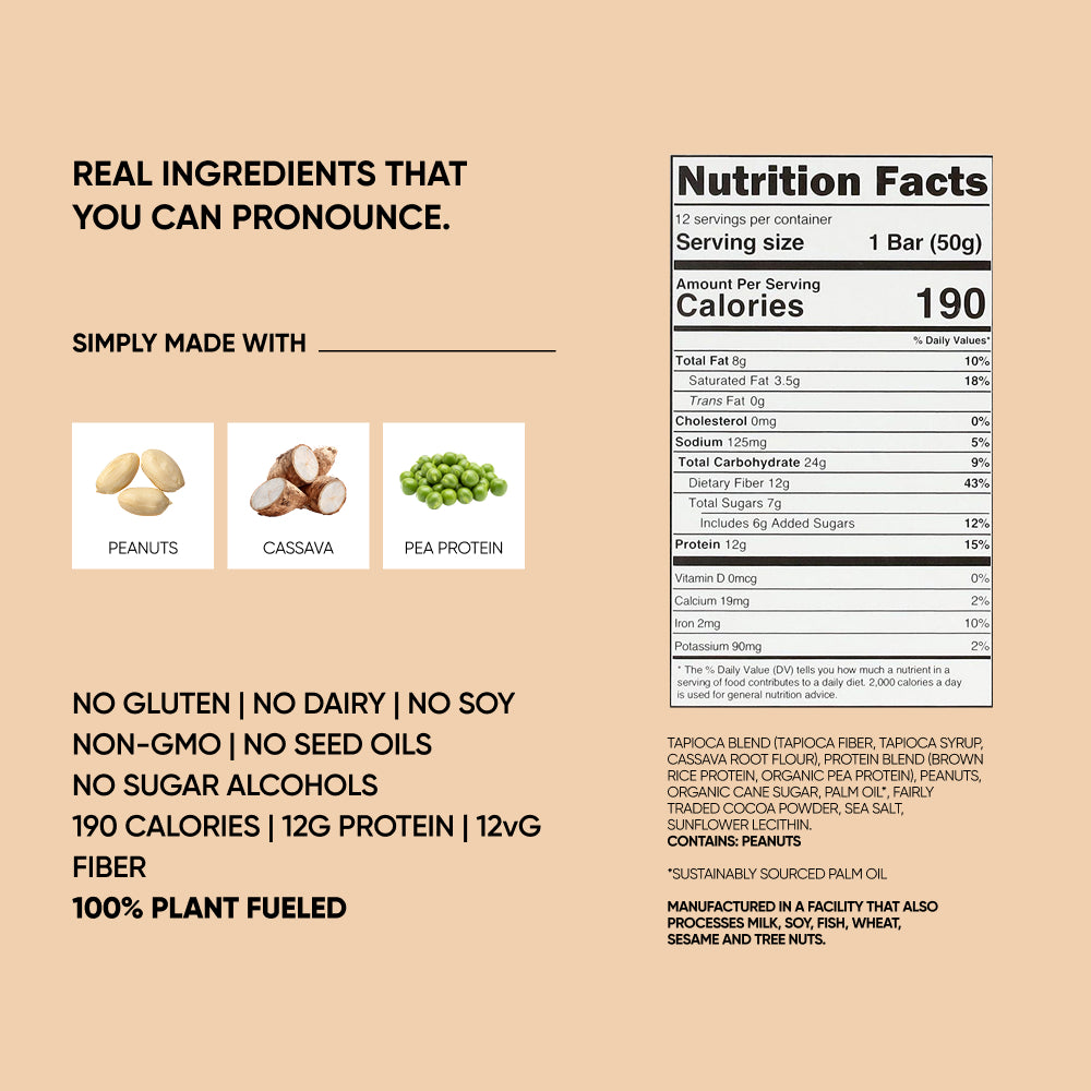 Ingredients: Tapioca blend (tapioca fiber, tapioca syrup, cassava root flour), protein blend (brown rice protein, organic pea protein), peanuts, organic cane sugar, palm oil*, natural flavors, sunflower lecithin, medium chain triglycerides, sea salt.
