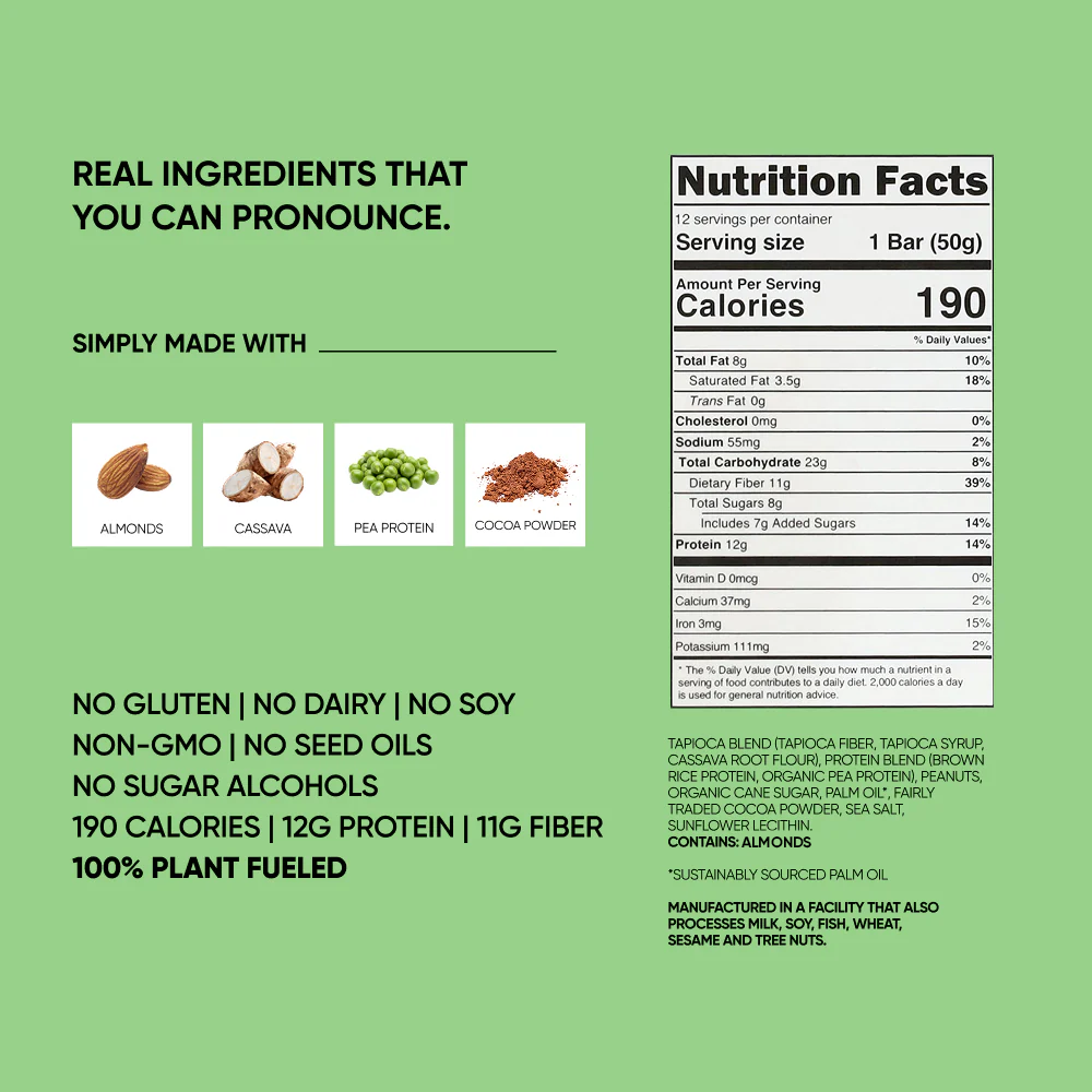 Ingredients: Tapioca blend (tapioca fiber, tapioca syrup, cassava root flour), protein blend (brown rice protein, organic pea protein), almonds, organic cane sugar, palm oil*, fairly traded cocoa powder, unsweetened chocolate, cocoa butter, natural flavors, sunflower lecithin, sea salt, organic peppermint oil.
